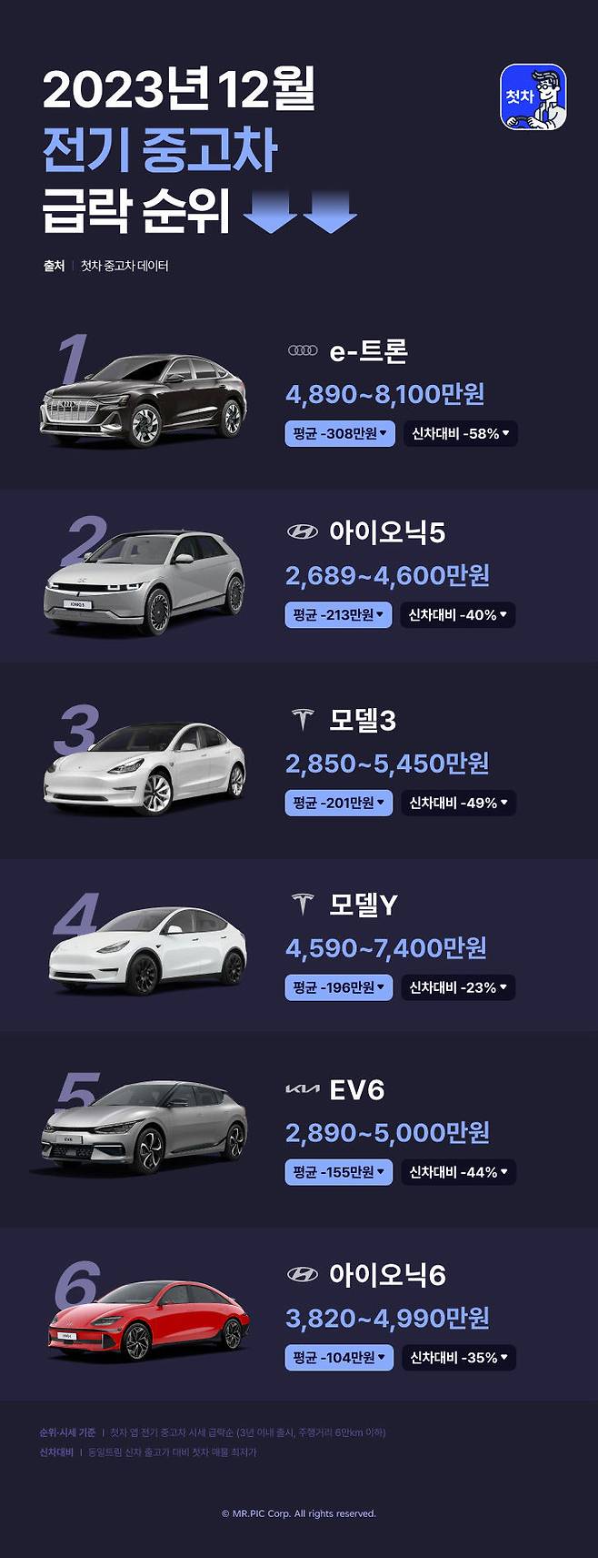 중고차 거래 플랫폼 ‘첫차’가 2023년 12월 주요 중고차 모델들의 급격한 가격 하락 순위와 현재 시장 가치를 대중에 공개했다.