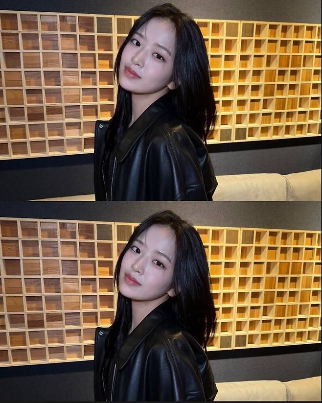 안유진은 블랙 가죽 재킷에 데님 팬츠를 매치해 시크하면서도 캐주얼한 무드를 완벽히 소화했습니다.