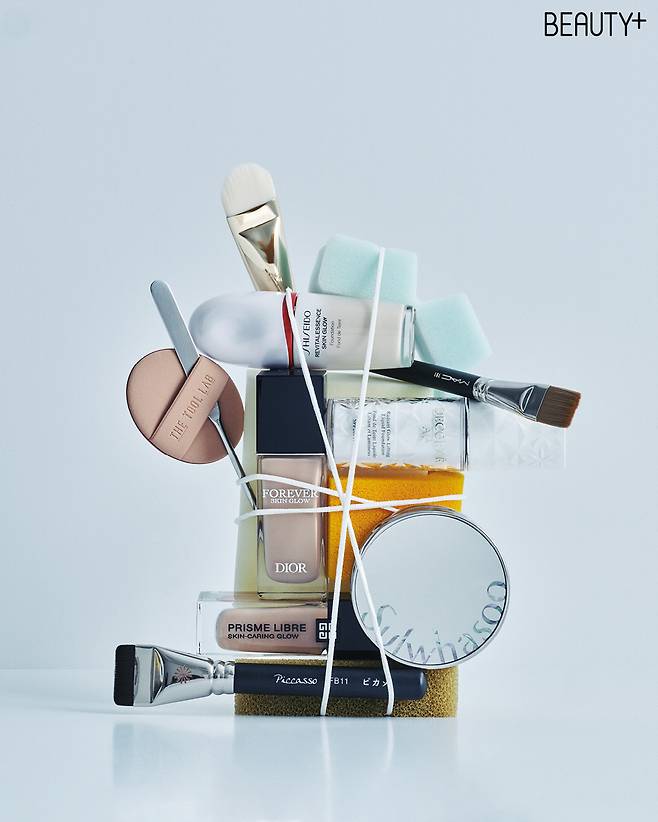 매트 파운데이션을 활용할 수는 없는지에 대해 종종 묻는데, 글로우 파운데이션을 사용하는 것이 가장 현명한 방법이다. 매트한 제형의 파운데이션에 세럼이나 오일을 섞어 쓸 수는 있지만, 글로우 파운데이션이 지닌 고유의 장점보다는 못하다. 설화수 에어리 쿠션처럼 몇몇 글로우 쿠션도 제법 훌륭하니 참고할 것. 이와 함께 밀도감 높은 통루비셀 퍼프를 사용해 눌러 바르기보다 얹어 바른다. 즉각적으로 차르르한 광이 살고 오래도록 유지하는 데 도움을 준다.