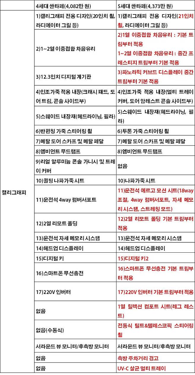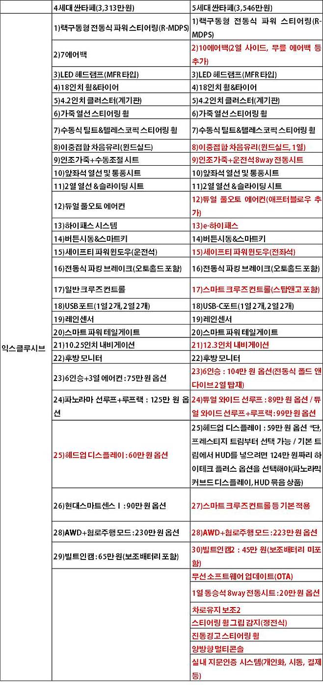 먼저 가장 기본 트림인 익스클루시브의 사양을 1:1로 비교했다. 차이가 발생하는 부분은 빨간색으로 표기했다. 233만 원의 가격 차이만큼, 기본 모델의 사양이 5세대가 한층 풍성하다. 우선 에어백은 7개에서 10개로 늘었다. 2열 사이드, 운전석 무릎 등에 에어백을 추가했다. 또한, 실내 정숙성 확보에 도움을 주는 이중접합 차음유리는 윈드실드뿐 아니라 1열에도 추가했다.