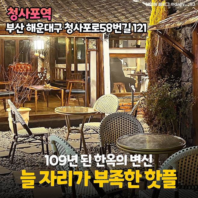 지하철역 이름 같은 <청사포역>은 고즈넉한 골목 안에 자리한 한옥 카페에요. 무려 109년이나 된 한옥이라는데 예쁘게 꾸며두신 덕에 전혀 티가 나지 않는다고! 청사포역은 반려동물과 함께 입장할 수 있는 곳이지만, 아담한 규모라 자리가 늘 많지는 않다고 해요.