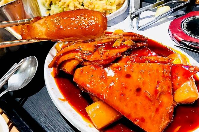 상국이네 떡볶이는 보기에 유난히 새빨간 색이지만 맵찔이도 맛있게 먹을 수 있을 정도로 맵지 않다고 해요. 맛에 대해서는 달달하면서도 자극적이라는 후기들이 많더라구요. 떡은 보통의 떡볶이에 사용되는 것에 비해 굵은 편이고, 별다른 토핑 없이 떡과 오뎅만 들어 있어요.