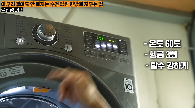 지방산은 상온에서 굳어 있는 성질이 있다. 이를 제거하려면 기름을 녹여낼 수 있는 ‘알칼리 세제’와 ‘60도 이상의 온도’가 반드시 필요하다. 세탁 시 알칼리 세제를 수건 무게에 맞춰 넉넉히 넣고, 온도는 60도로 설정한다. 수건은 면 섬유로, 알칼리에도 강하고 고온에도 잘 견딘다. 또한 탈수는 ‘강’으로 설정해 잔여 기름과 수분까지 확실하게 제거해야 한다. 이 과정을 두세 번 반복하면 냄새가 사라진다. 지방산을 제거했기 때문이다.