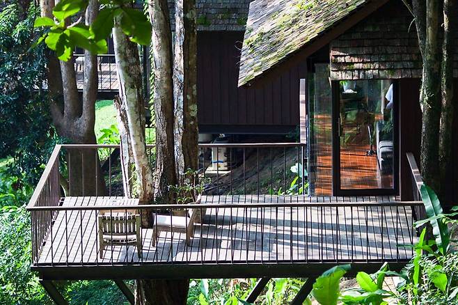 숲속 곳곳에는 빌라 형태의 객실이 자리잡고 있습니다. 트리하우스를 떠올리게 하는데요.