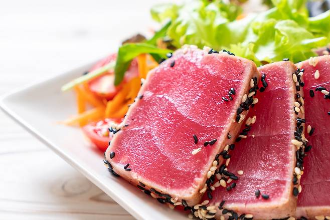 이달부터 오는 6월까지가 제철인 참다랑어는 오메가3지방산이 풍부한 생선이다. 특히 오메가-3 지방 계열 가운데 DHA와 EPA가 많다.