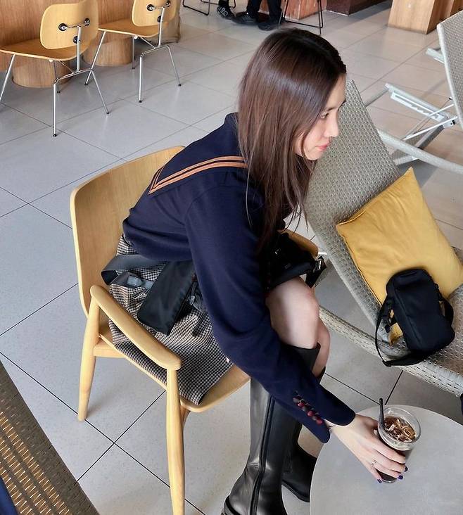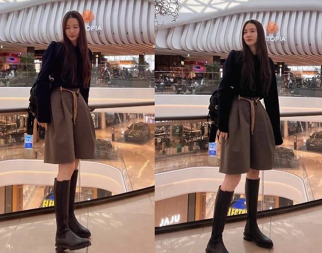 또, 통이 넓은 회색 모직 반바지와, 롱부츠를 매칭해, 시크하면서도 보온성을 챙긴 패션을 선보였습니다.
