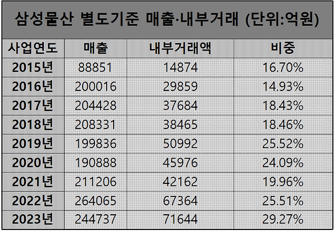 합병 첫해인 2015년의 내부거래액은 1조4874억원(연간 매출액 대비 16.7%)으로 회복한 뒤 2016년 2조9859(14.93%), 2019년 5조992억원(25.52%), 2023년 7조1644억원(29.27%) 등으로 증가했다. 연간 매출의 10~30%에 달하는 금액을 내부거래로 채우며 성장가도를 달려온 셈이다. 지난해 공정거래위원회는 삼성그룹을 내부거래 비중이 높은 집단 3위로 명시하기도 했다.