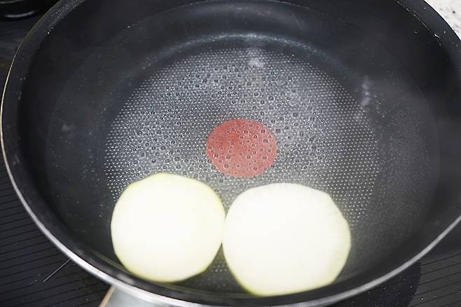 문어를 삶기 전, 냄비에 물을 넉넉히 붓고 무를 함께 넣어 끓입니다. 무를 사용하는 이유는 무가 문어의 비린 맛을 잡아주고 국물에 깊은 맛을 더해주기 때문입니다. 무가 익을 정도로만 끓여주고, 그 다음 문어를 삶을 준비를 합니다.