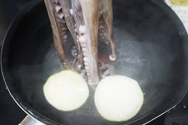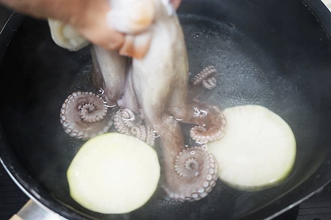 문어 다리를 끓는 물에 넣었다가 빼는 과정을 세 번 정도 반복한 후, 전체 문어를 넣고 삶기 시