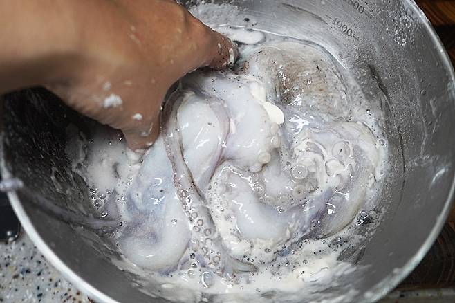 밀가루를 손에 묻혀 문어를 조물조물 문질러 주면 점액질이 잘 제거됩니다.