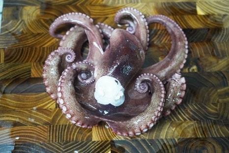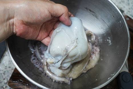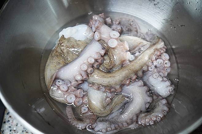 문어를 손질하는 첫 단계는 깨끗하게 씻는 것입니다.