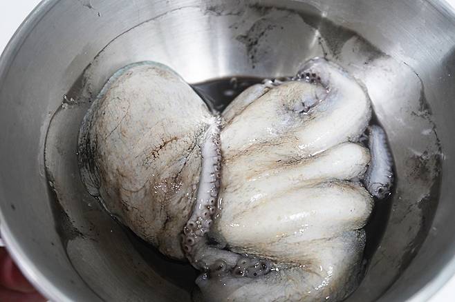 문어를 손질하는 첫 단계는 깨끗하게 씻는 것입니다.