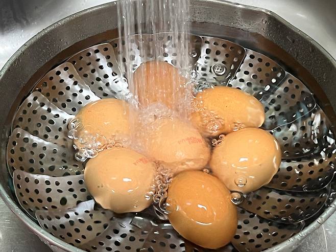 조리가 끝난 계란은 밖으로 꺼내 충분히 식혀 줍니다. 삶은 계란과는 다르게 구운 계란은 굳이 찬물에 담글 필요가 없습니다.