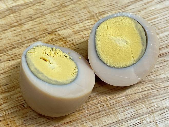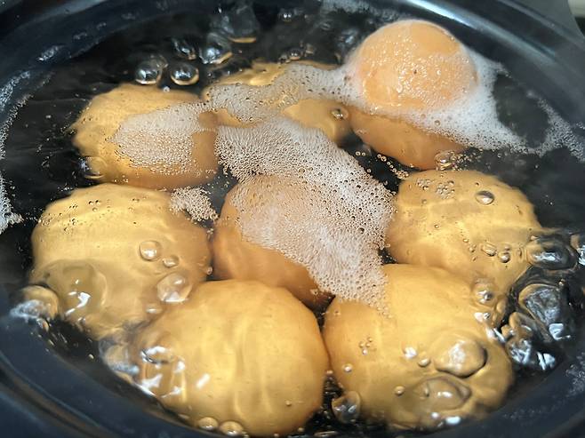 밥솥으로 찐 계란은 완숙 형태로 조리됩니다. 마치 찜질방에서 먹는 계란과 유사합니다. 향도 더 구수해서 삶은 계란보다 맛있습니다.