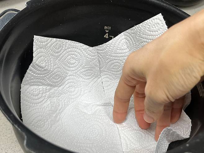 밥솥에 키친 타월을 1~2장 깔아 줍니다. 밥솥에 키친타월을 까는 이유는 계란이 바닥면에 눌어붙지 않기 하기 위해서입니다.