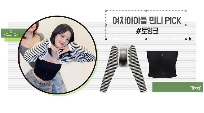 민니는 블랙탑과 스트라이프 볼레로를 착용해