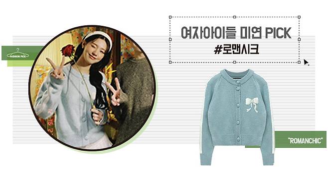 여자아이들 미연은 블루 컬러에 화이트 리본이 포인트인 가디건과