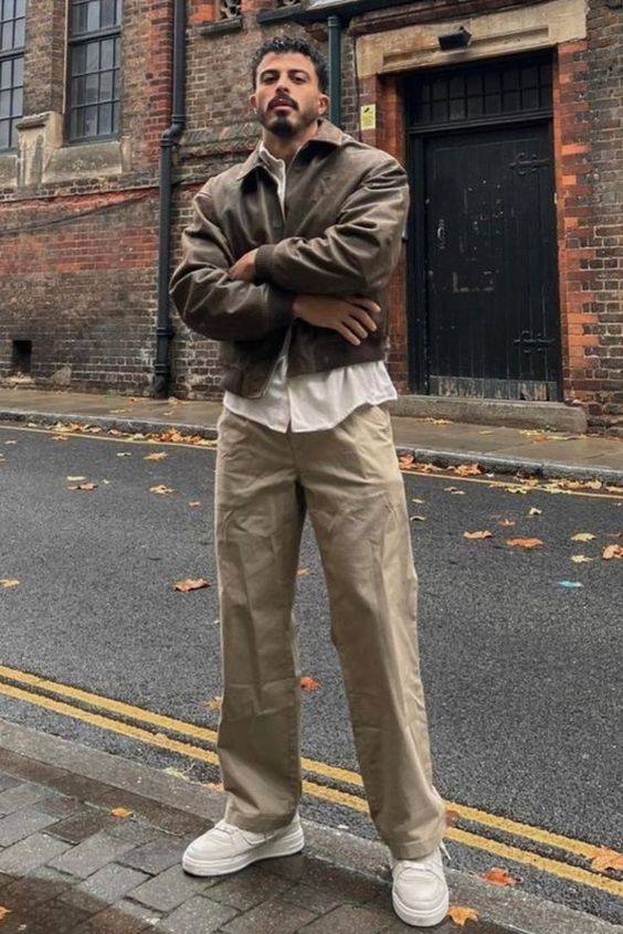 베이지 셔츠 자켓과 함께 베이지 컬러의 운동화 매치하면