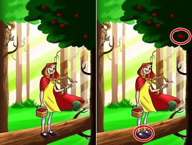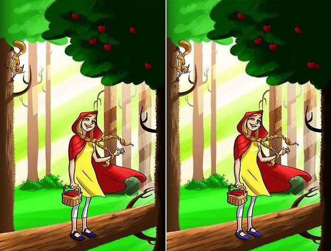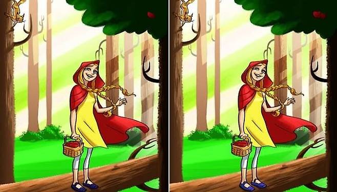 빨간 모자를 쓰고 있는 여성이 똑같이 그려져 있는 그림이 있는데요. 이 그림은 같아 보여도 사실 다른 점이 숨어 있습니다.