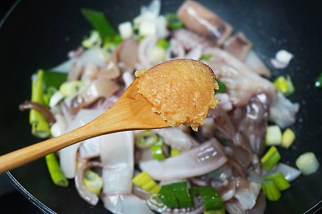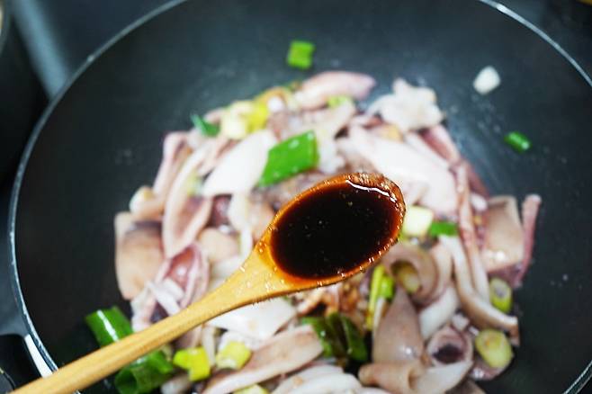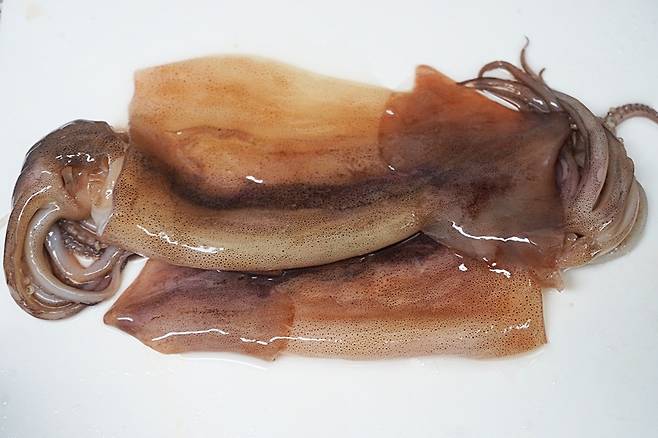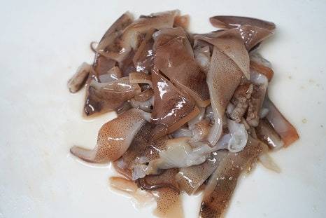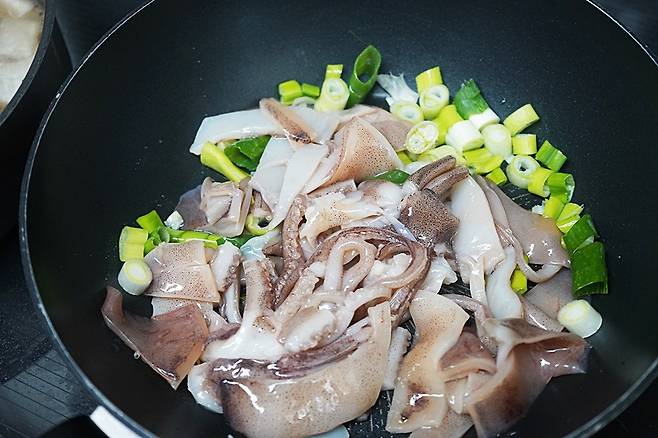 오징어는 깨끗하게 씻은 뒤 먹기 좋은 크기로 잘라줍니다.