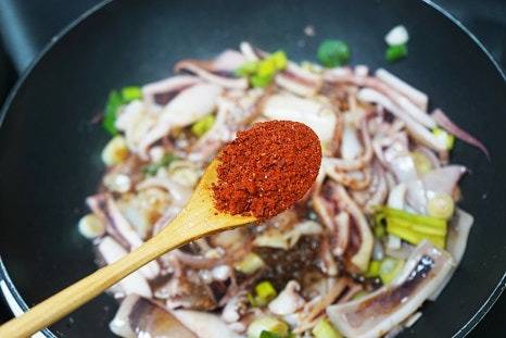 다음으로 고추장 1큰술과 고춧가루 3큰술 을 넣어 매콤한 맛을 더해줍니다.
