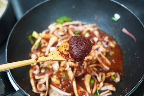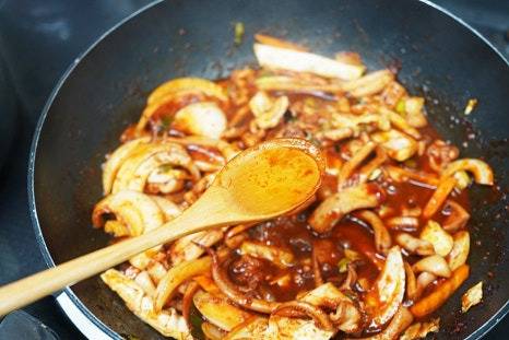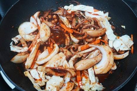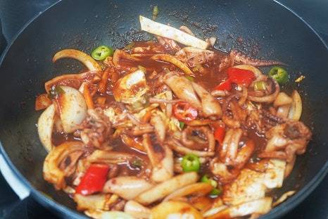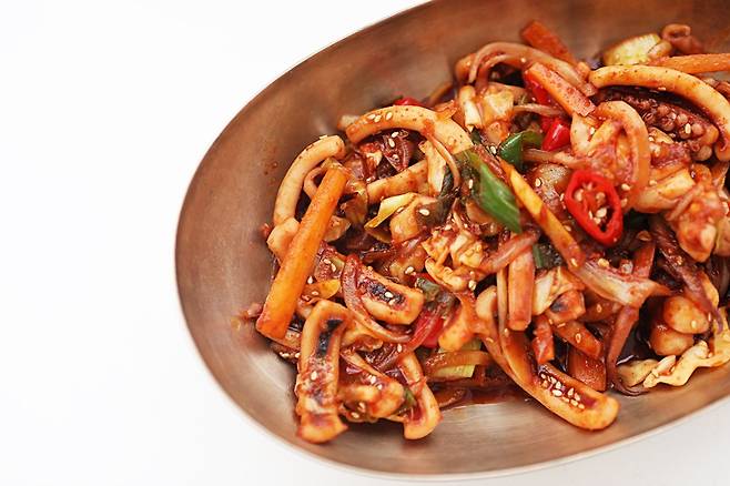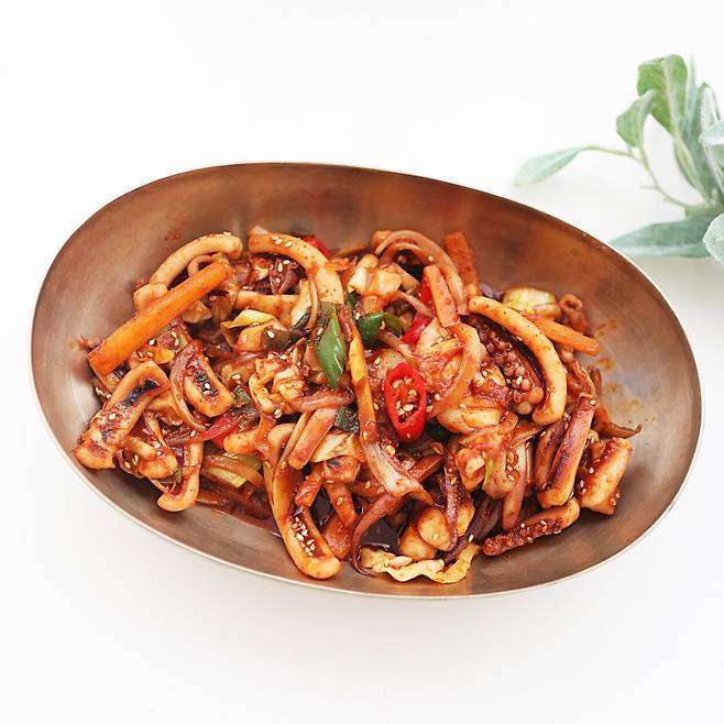한국식 매콤달콤한 볶음 요리인 오징어볶음