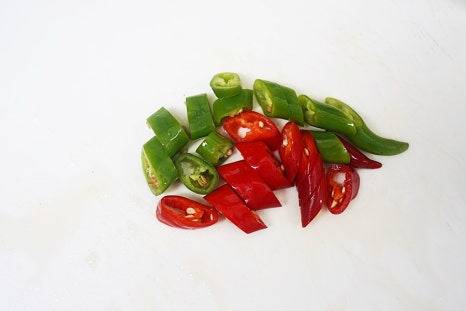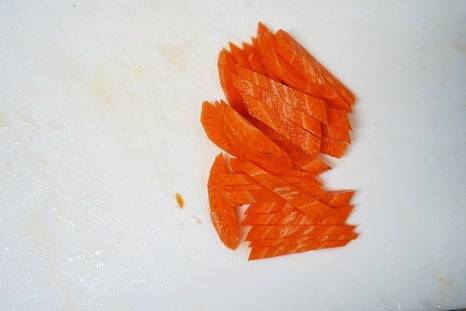 당근은 1/4개 정도를 적당한 크기로 썰고 청고추 2개와 홍고추 1개는 어슷썰기로 준비합니다.