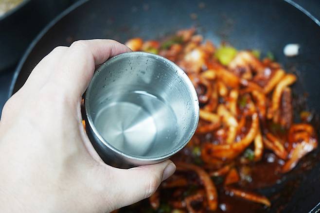 양념을 다 넣었으면 볶다가 약간 촉촉하게 해주기 위해 물 반 컵을 넣어줍니다.
