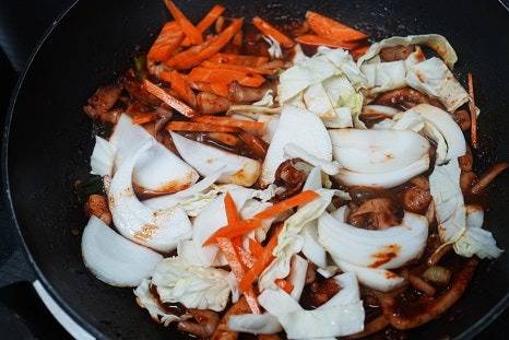 물이 들어갔을 때 손질한 야채를 모두 넣어줍니다. 야채가 많아 보여도 볶다 보면 숨이 죽어 양이 줄어드니 걱정하지 않으셔도 돼요.