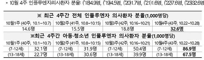 ▲ 환자 수가 1주일새 70% 넘게 급증했다. 올해 43주차(10월 22~28일) 외래환자 1천 명당 인플루엔자 의심 증상을 보이는 환자 수(인플루엔자 의사환자 분율)는 32.6명으로, 직전주 18.8명보다 73.4%나 늘었다. 유행은 초등학생과 중고등학생 연령대에서 특히 심하다. 의사환자 분율은 7~12세 86.9명, 13~18세 67.5명으로 이번 절기 유행 기준(6.5명)의 각각 13.4배와 10.4배다. 의사환자 분율은 코로나19 유행 직전인 2019년 겨울보다 높아 동기간 유행 규모가 최근 5년 새 가장 크다.