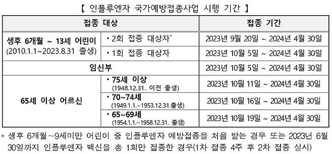 ▲ 생후 6개월 이상부터 13세 어린이(2010년 1월1일~2023년 8월31일 출생), 임신부, 65세 이상 어르신이 국가 지원대상으로, 무료 접종을 받을 수 있다