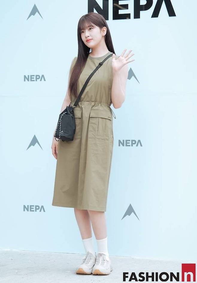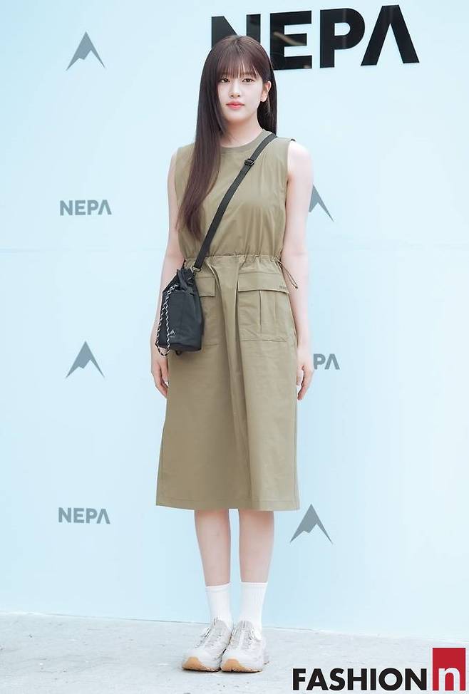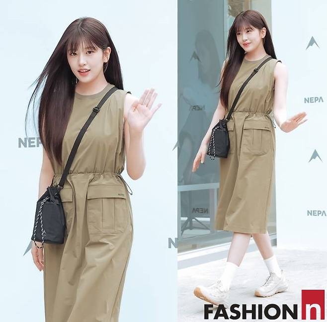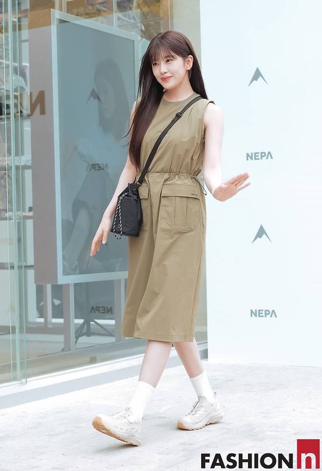 이날 안유진은 앞머리를 내린 긴 생머리에 카키 스트링 민소매 원피스, 여기에 베이지 삭스와 운동화를 매치한 등산과 일상 경계를 허문 원피스룩을 선보였다.