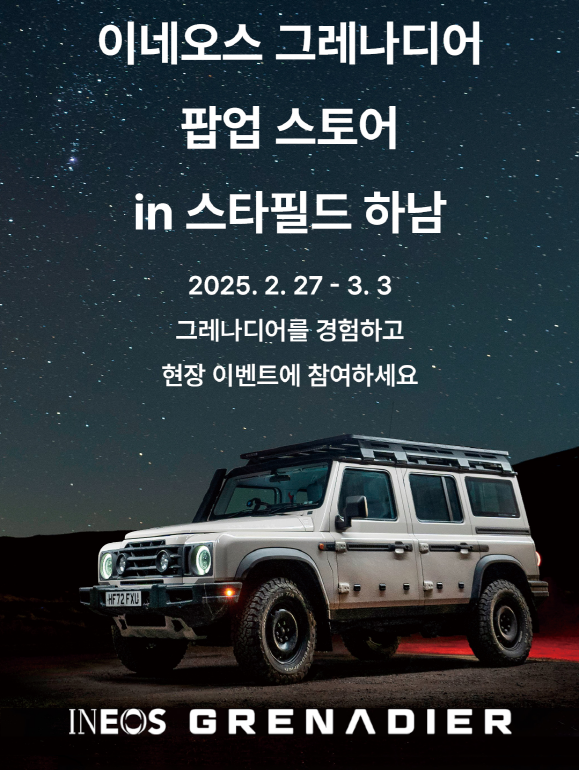 이네오스 오토모티브의 국내 공식 수입원인 차봇모터스가 오는 2월 27일부터 3월 3일까지, 3월 첫째 주 연휴에 맞춰 스타필드 하남(경기도 하남시 미사대로 750) 1층 중앙 광장에서 팝업 스토어를 운영한다.
