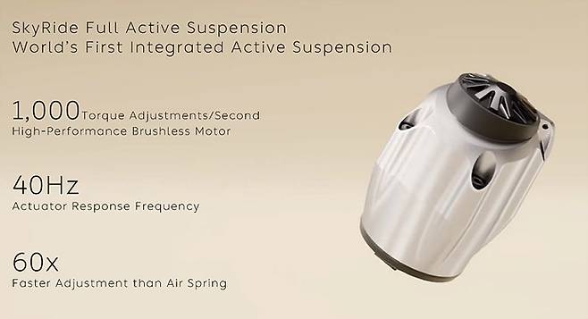 SkyRide는 기존의 전자기식이 아닌 전자유압식 시스템으로, 차량 네 바퀴 각 모서리에 전용 유압 펌프와 저장 장치를 배치한 구조다. 펌프는 1초에 1,000회의 토크 조정을 수행하며, 전체 서스펜션 움직임은 108mm 범위 내에서 조절된다. 기존의 에어서스펜션보다 60배 빠르게 바퀴 위치를 조절할 수 있으며, 반응 시간은 40Hz 수준이다. 하중 지지는 에어스프링이 담당하고, 실시간 높이 조절과 댐핑은 유압장치가 수행한다.