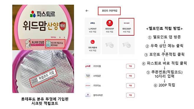 - 아이생각, 위드맘 등 롯데푸드 제품(분유 등) 뚜껑 안쪽에 있는 스티커를 엘포인트 앱을 통해 입력하면 추가 적립 가능