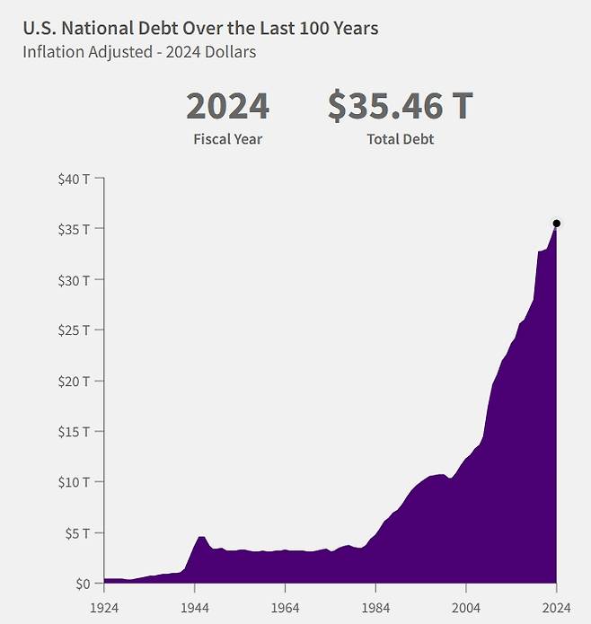 미국 국가부채가 이렇게 막대하게 불어난 것은 연방정부가 장기간 재정적자를 냈기 때문이다. 미국 정부는 2001년 이후 매년 재정적자를 기록했다. 2016년부터는 사회보장제도, 의료 서비스, 이자 지급에 들어가는 돈이 재정 수입보다 빠르게 증가했고 2019~2021년에는 코로나19에 대응하는 과정에서 지출이 급증했다. 수입에 비해 씀씀이가 커지면서 재정적자가 커졌따. 2024 회계연도 한 해 재정적자만 1조8300억달러에 달했다.