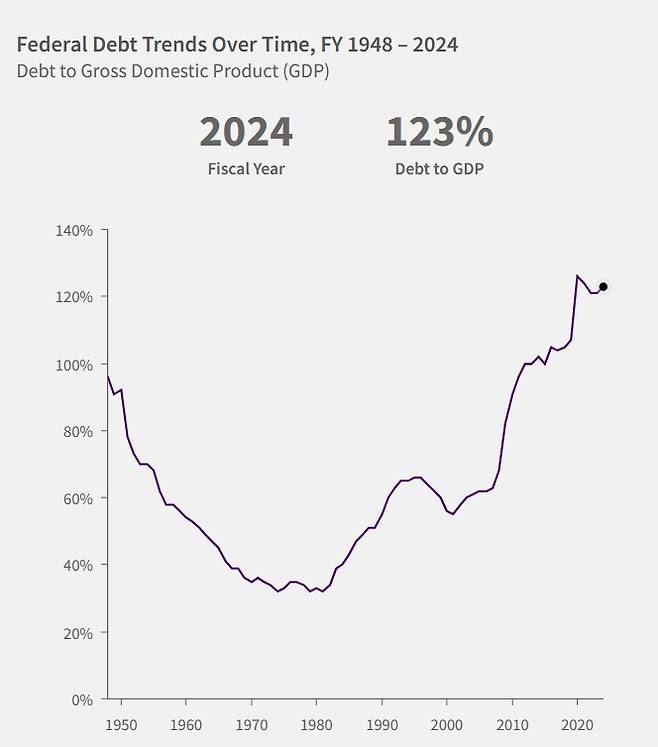 미국 재무부에 따르면 미국의 국가 부채는 지난 15일 기준 약 36조2200억달러(약 5경740조원)다. 국내총생산(GDP) 대비 부채 비율은 지난해 기준 123%다. 국가부채가 경제 규모의 1.2재가 넘는 것이다.