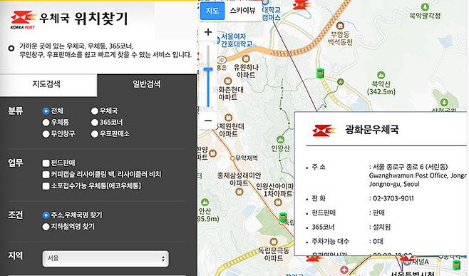 분류 항목에서 우체통을 체크하고, 지역과 상세주소를 입력하면 알아보기 좋게 리스트로 위치 정보를 제공해준다.