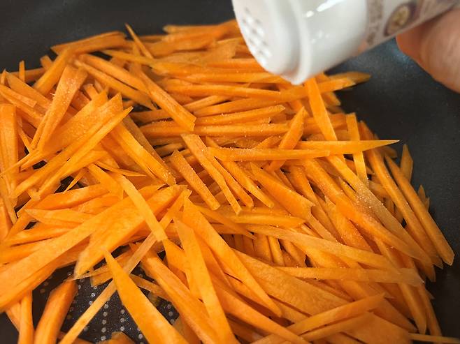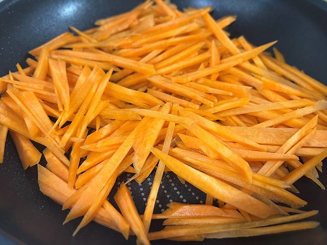 당근 1개는 채를 썬 다음 중 약불에 볶습니다. 당근은 기름을 살짝 넉넉히 두르고 볶아야 풍미가 확 올라오면서 고소해져요.