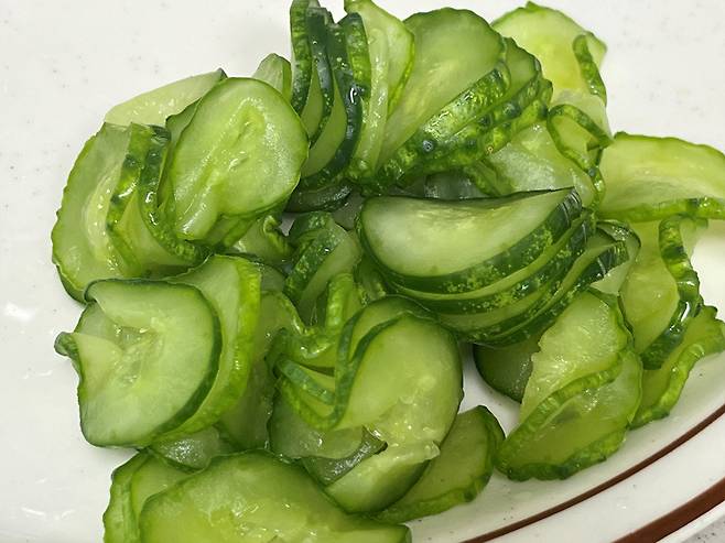 오이는 최대한 얇게 자른 다음 소금에 15분간 절여 놓으세요.