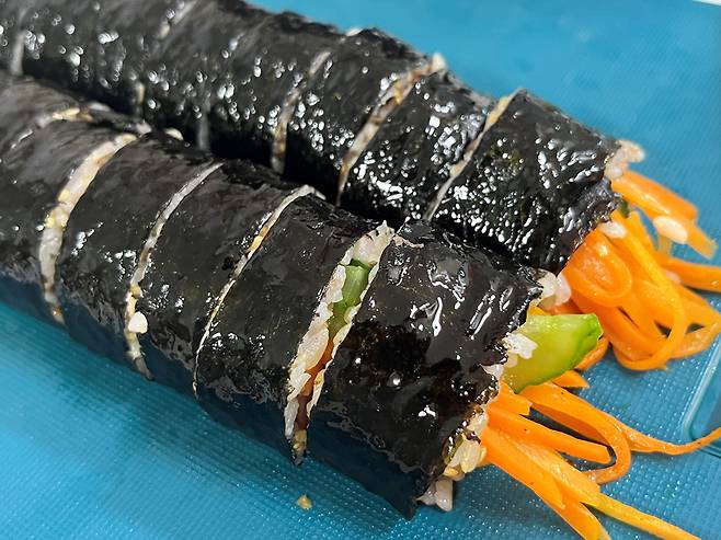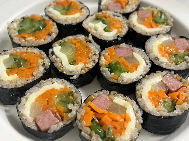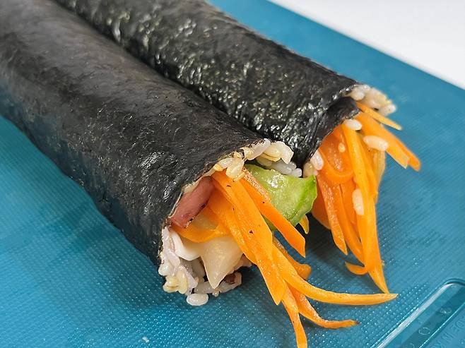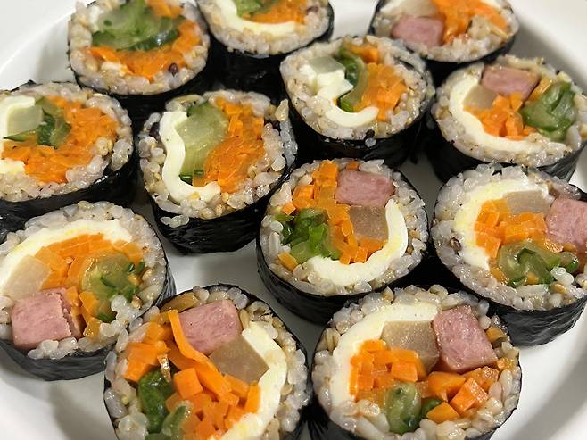 치즈의 고소함과 당근, 오이, 단무지의 조합이 굉장히 좋습니다. 건강하고 산뜻한 느낌의 김밥을 원한다면 이 재료 조합으로 꼭 만들어 보세요!