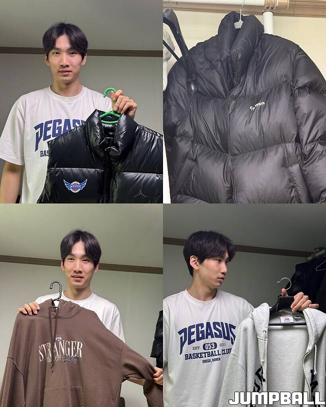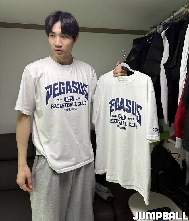 후드집업, 후드티, 맨투맨까지… 패션 철학을 느끼게 하던 옷들이 연속함수 마냥 나오던 시점. 취재진과 김민규의 폭소를 자아내는 한 컷이 연출되었다. 페가수스 반팔티, 페가수스 반팔티.. 몇 장을 받은 건지 셀 수 없을 정도로 많은 가스공사 구단의 반팔티가 걸려 있었다. “대구가 느끼셨다시피 3월에도 낮에 굉장히 더워요. 그렇다 보니 구단에서 주신 이 반팔티를 몇 벌씩을 챙기게 됩니다. (지금도 입고 계시네요) 앗! 그렇네요(웃음).”