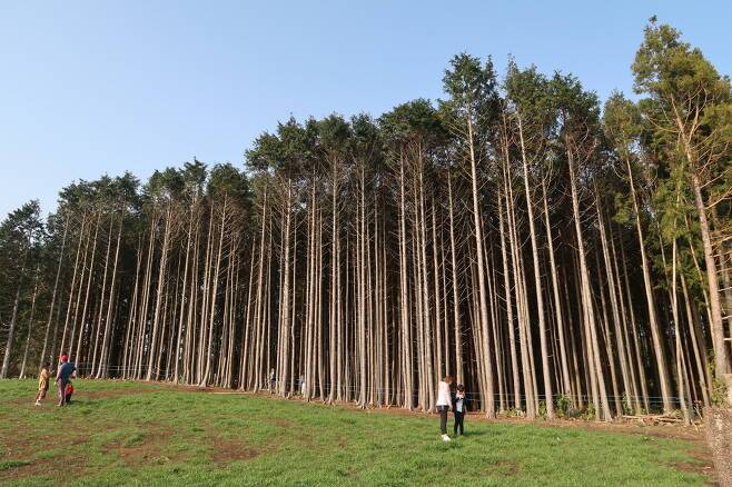 제주도 구좌읍에 있는 ‘안돌오름 비밀의 숲’은 북유럽의 숲을 연상케 하는 공간이다. 새소리를 들으며 좁은 숲길을 따라 걷다 보면 울창한 편백나무들이 반긴다. 빼곡히 들어선 편백나무가 하늘 높이 솟아 있는 풍경이 장관을 이룬다. 해가 질 때쯤이면 나무를 둘러싼 전구에 하나둘씩 불이 켜져 아늑한 숲의 정취를 만끽할 수 있다.