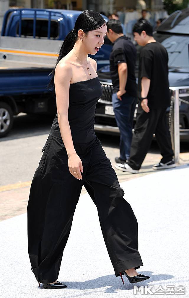 튜브톱 스타일의 슬리브리스 상의에 와이드 블랙 팬츠를 매치해 미니멀하면서도 당당한 무드를 완성했고, 매끈하게 넘긴 슬릭 한 포니테일 헤어와 날렵한 힐이 세련된 실루엣을 더욱 강조했습니다.
