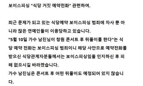 소속사는 “5월 10일 남진이 창원 콘서트 후 뒤풀이를 한다는 식당 예약 전화는 보이스피싱 범죄이니 해당 사안으로 예약전화를 받으신 식당 관계자들께서는 보이스피싱임을 인지한 후 피해 없길 바란다”고 당부했습니다.