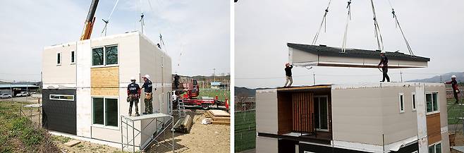 제작된 벽체(내벽, 외벽, 바닥)는 설계에 맞춰 모듈 조립의 단계로 넘어간다. 여기부터는 로봇보다는 사람이 주역인 공정이다. 벽체간 미세한 오차를 사람의 손으로 조절하고 수평을 맞춘다. 이때 지붕의 제작과 조립이 함께 이뤄지게 된다.