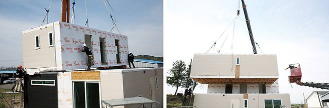 현장에서의 주택 모듈 조립은 배관 설치나 외부 마감의 완성도에 영향을 미치는 만큼 크레인의 힘을 빌린 사람의 손으로 세심하게 조율된다.