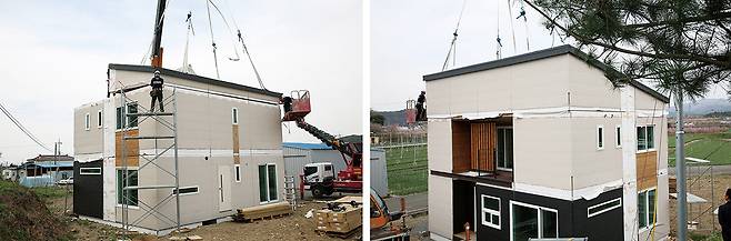 주택이 슈퍼팩토리에서 제작되는 중에 현장에서는 기초공사가 이뤄지게 된다. 제작을 마친 주택 모듈이 현장에 앉혀지고 있다.