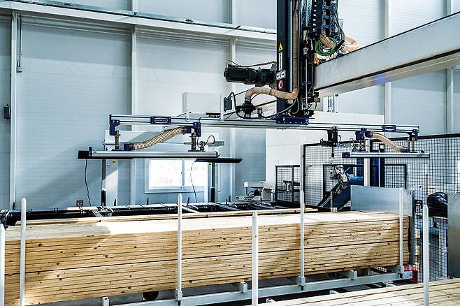 자재 투입과 절단, 두 가지 설비가 합을 이뤄 작업한다. 설계에 맞춰 자재의 길이나 폭을 맞추고, 자재가 쓰이는 부분에 따라서 대각선으로 자르거나 전선이나 배관이 지나가기 위한 홈인 ‘따냄’ 작업도 이뤄진다. 오차 범위가 ±0.05㎜ 이하인 정밀 작업이다. 절단 작업이 이뤄지는 만큼 안전 장치에도 만전을 기했다.
