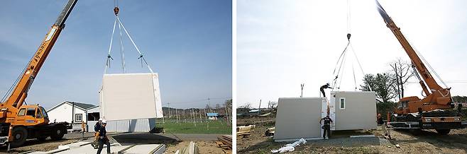 현장에서의 주택 모듈 조립은 배관 설치나 외부 마감의 완성도에 영향을 미치는 만큼 크레인의 힘을 빌린 사람의 손으로 세심하게 조율된다.